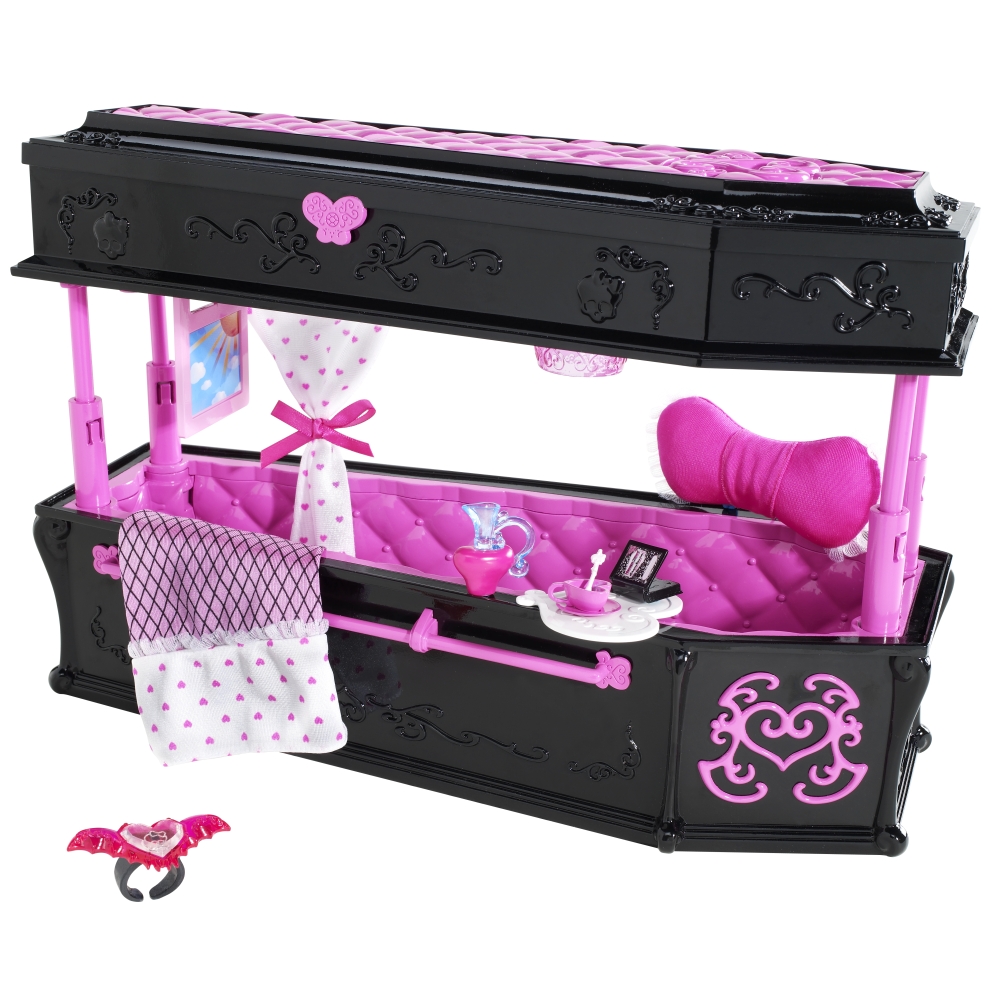 O caixão da draculaura vem comuma caneta com a skullete da MH , uma xícara , uma jara , Tv , Cortina , cobertor , e um cantinho pro conde fabulous